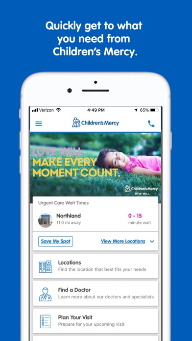 The Children's Mercy app helps you handle the details of your child's health care visit so you can focus on what's most important: your child. Save your spot at one of our urgent care clinics, plan for an upcoming appointment and get turn-by-turn directions to navigate the Children's Mercy Adele Hall Campus in downtown Kansas City. Save My Spot When your child is hurt or sick, your first priority is getting them the care they need as quickly as possible. With the Children's Mercy app, you can find the nearest urgent care location, see wait times and save your spot in line, all without leaving the comfort of your own home. Make the living room your waiting room--we'll text you to head in for your scheduled time. Plan Your Visit If you have an upcoming appointment or procedure scheduled at one of our hospitals or clinics, use the "Plan My Visit" feature to see a list of everything you need to bring, get directions to your appointment location and know what to expect so you and your child feel confident and prepared. You'll find hospital amenities, dining options and pharmacy hours here, too. Navigate Children's Mercy Adele Hall Campus Our interactive map helps you easily navigate our downtown Kansas City location, both before you arrive and while you're there. Turn-by-turn directions help you locate the nearest place to eat, get from a specialty clinic to the lab or pharmacy and even explore points of interest like art galleries and play spaces inside the hospital in between appointments. Connect With Your Care Team You can use the app's "Find a Doctor" feature to research the many skilled providers at Children's Mercy. After your visit, securely access medical records and communicate with your care team through MyChildrensMercy, our patient portal. Log in to your existing account through the app or find out how to get connected to the portal.